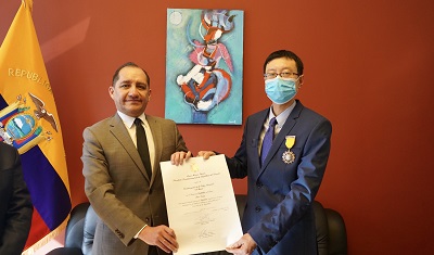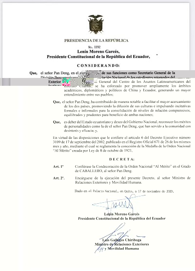 The protocol officer read the Executive Order 1192, countersigned by President Lenín Moreno and Foreign Minister Luis Gallegos on 17 November, 2020. In his executive order, the President spoke highly of Mr. Pan Deng's consistent commitment to promoting wide-ranging exchanges between Ecuador and China in the academic, diplomatic and political fields, and to promoting the development of bilateral relations from multiple perspectives, which has promoted the spread of culture and mutual understanding between the two countries and benefited the two peoples. In recognition of his selfless and efficient service to society and his outstanding contribution to the close relations between China and Ecuador, Mr. Pan Deng was awarded the National Order of Merit at the knighthood level.