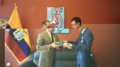 Ambassador Larea, on behalf of President Moreno, awarded a medal and a certificate to Pan Deng and extended his heartfelt congratulations on his achievement. He said that it is an important tradition of the Ecuadorian government to award national medals to international personalities who have made outstanding contribution to the friendship between the two countries through executive decrees issued by the President. “At present, Ecuador-China relations are very friendly and smooth. We need not only exchanges and cooperation between governments, but also cultural and academic exchanges between peoples. Mr. Pan Deng is an example in this regard. He has made positive contribution to the communication and cooperation between the two countries. He has been recognized and commended by the Ecuadorian president.”Larea hoped that more people will continue to work for the friendship and cooperation between the two countries.